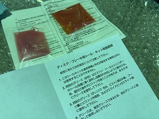 フロントと違ってリアはなぜかグリスが二種類入っておりました。 反射で色がよく分からなくなっておりますが、左が赤色、右がオレンジ色です。 取説を抜粋すると・・・ 同封のグリース(赤色)はピストン・シールとシリンダーのシール用溝に薄く塗布し油膜切れのないように組付ける。 同封のグリース(オレンジ)色は、ピストン組み込み後、ブーツ裏とピストン外周部、およびスライドピンのスライド部に塗布して 下さい。 とのことです。 |