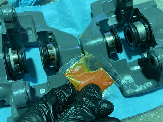 今回赤色のグリスは使用せず、これまた代わりにワコーズの高級グリスをOリングに塗布しキャリパーに組付けました。 |