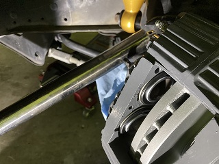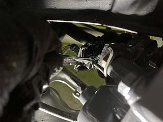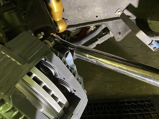 ブレーキチューブを車体側に以前組んだメッシュホースに合体させます。 まずはフレアナットが噛むまで手締めで締めて・・・ |