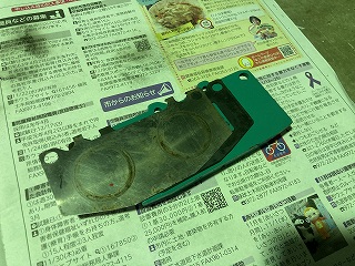 これはフロントですが上からシム、スリットの入った黒いシム、パッドの順です。 |