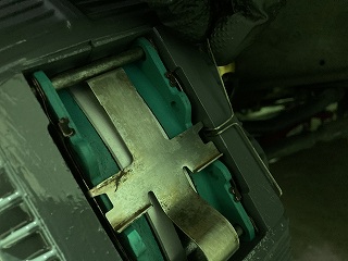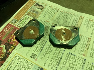 画像がコレしかありませんでしたがフロント同様黒いシムにもパッドグリスを塗り、銀色のシムはピストン当り面に塗っておきます。 |