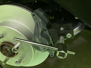パッドを入れようとしたらピストンが飛び出ていたのでピストン戻しツールで戻しておきました。 |